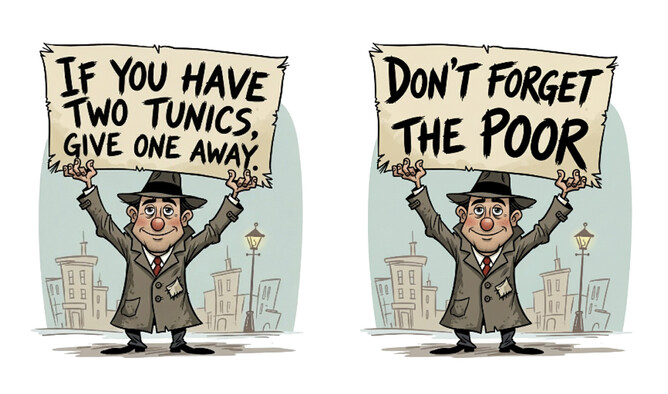 DISCUSSION: Which of the two quotes would have the strongest influence on a congregation if it were boldly emblazoned on a placard at the church: don’t forget the poor; if you have two tunics, give one away?