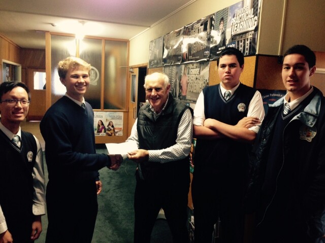 The Young Vinnies from St Patricks, Silverstream, Wellington raised $500 to help an old boy of their school who is now a tetraplegic and in Wellington’s spinal unit receiving care. Mike O’Leary, the co-ordinator for the Old Boy’s Association, receives the gift on behalf of the family.